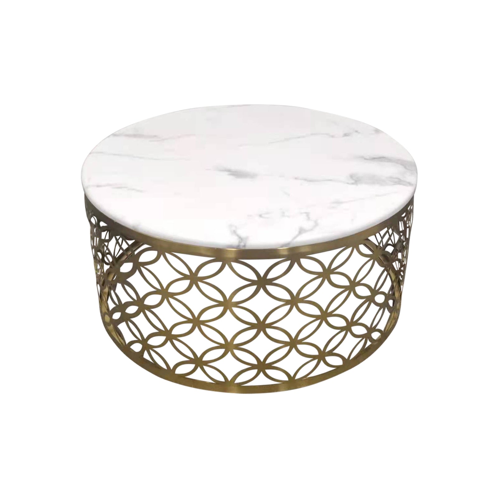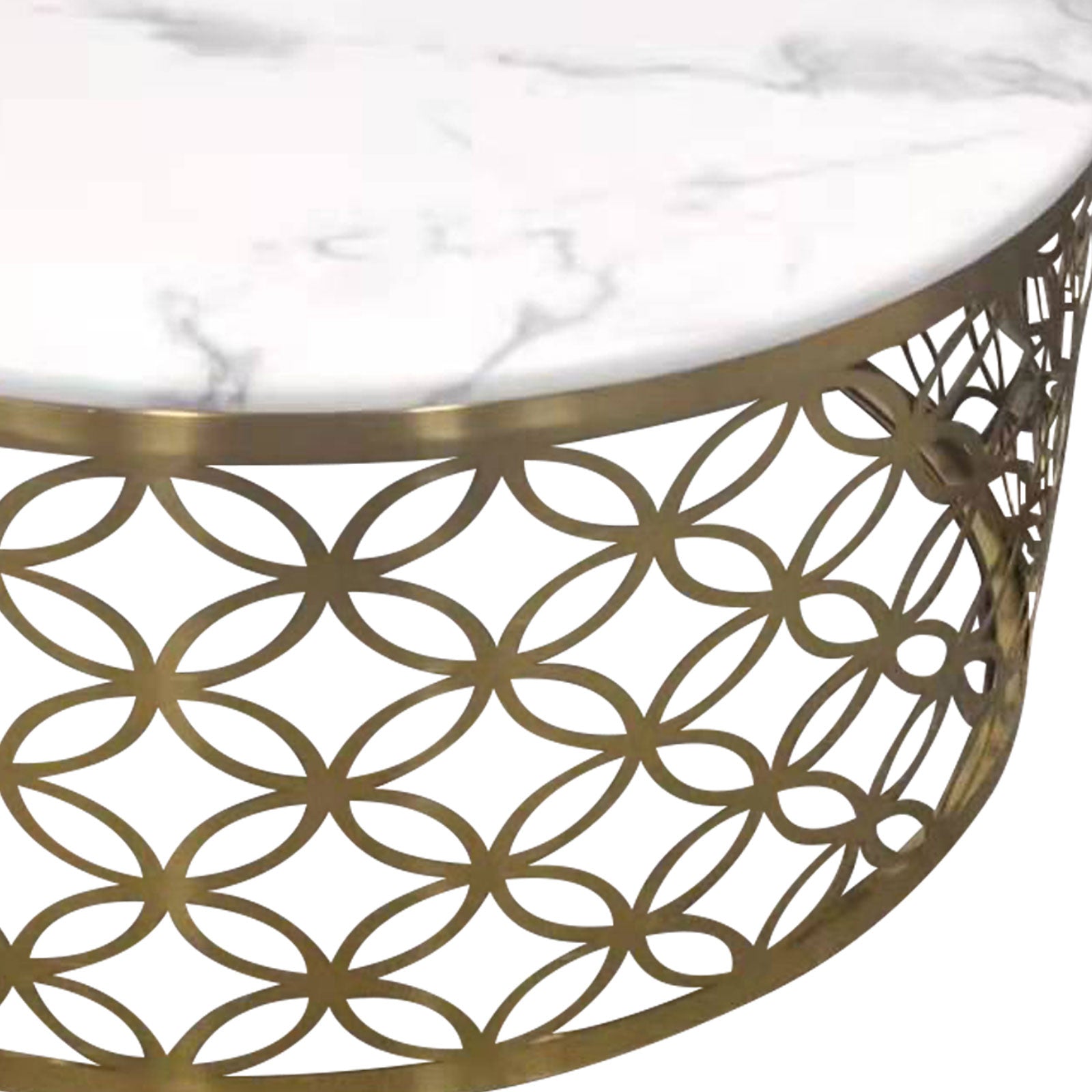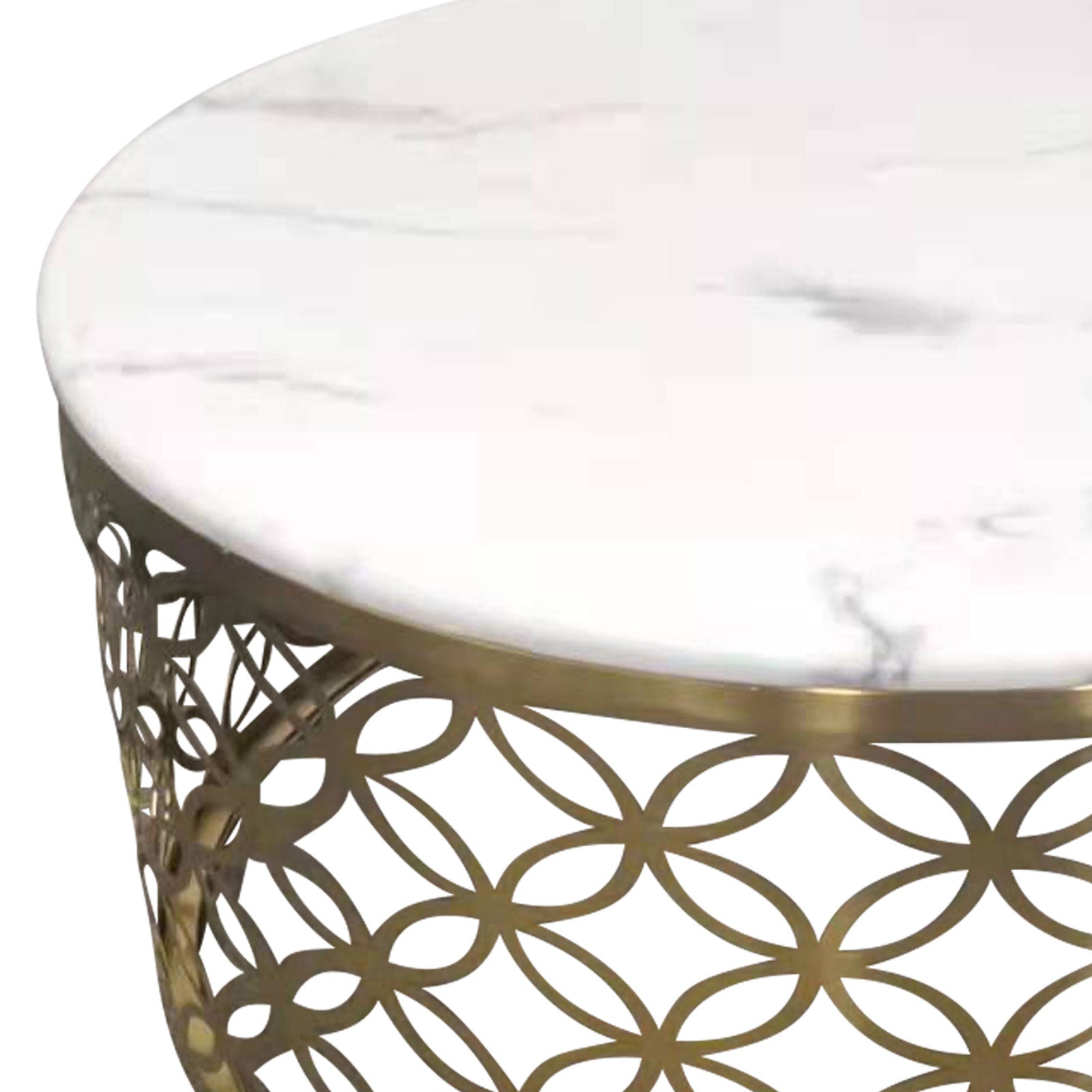 Coffee Table White Faux Marble Top Metal Manipulated Detail Design Round Shape Titanium Gold Stainless Troy