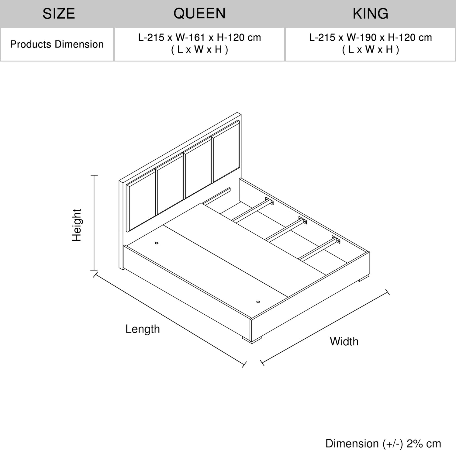 - Queen: Box 1: L-169 x W-126 x H-11.5, Box 2: L-214 x W-36 x H-10.5, Box 3: L-163 x W-31.5 x H-6.5, Box 4: L-210 x W-55 x H-5